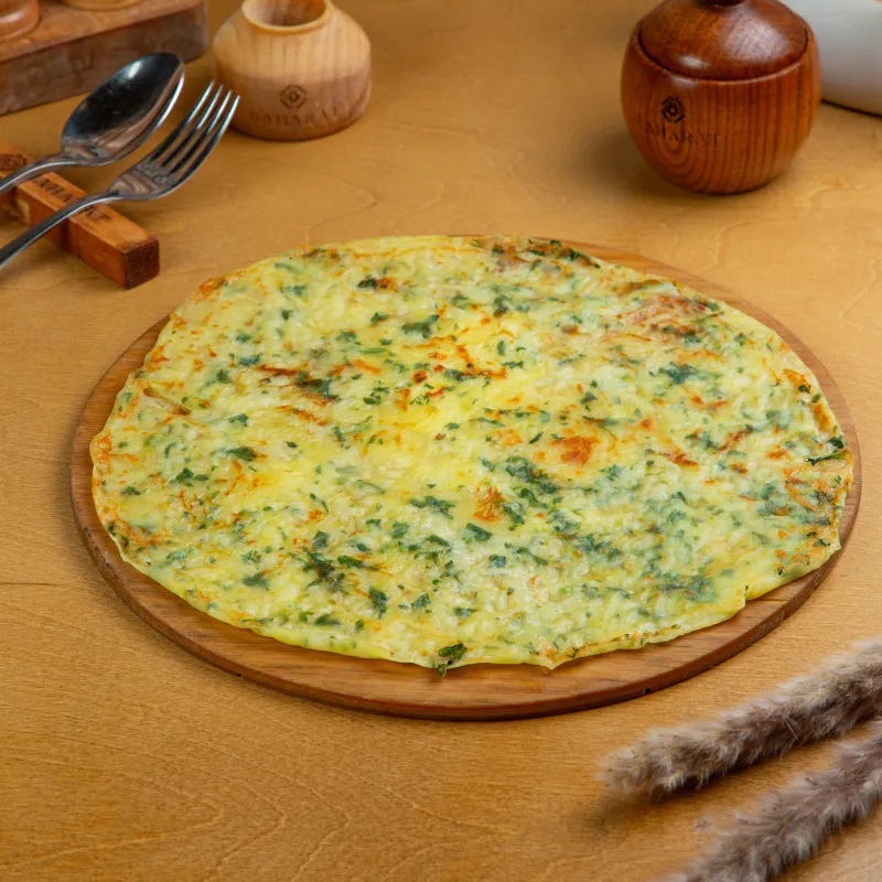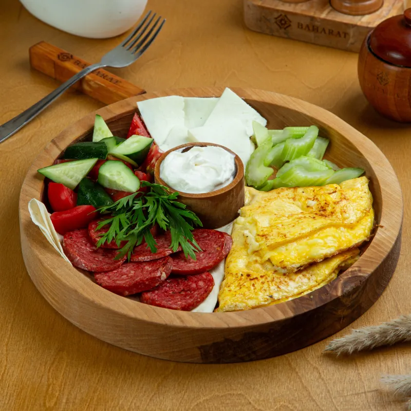 Омлет с сыром, колбаса суджук, лаваш, брынза, сельдерей, салат, соус.