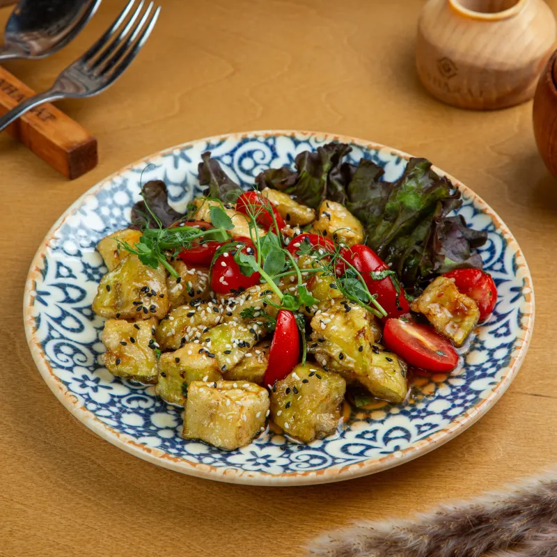 Жареные баклажаны, помидоры черри, лолло росса, кунжутные семена.