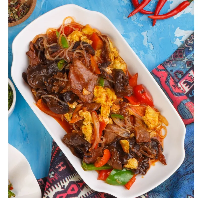 Обжаренное мясо говядины с древесными грибами, полу горьким перцем, фунчозой, шпинатом, репчатым луком и яйцом.