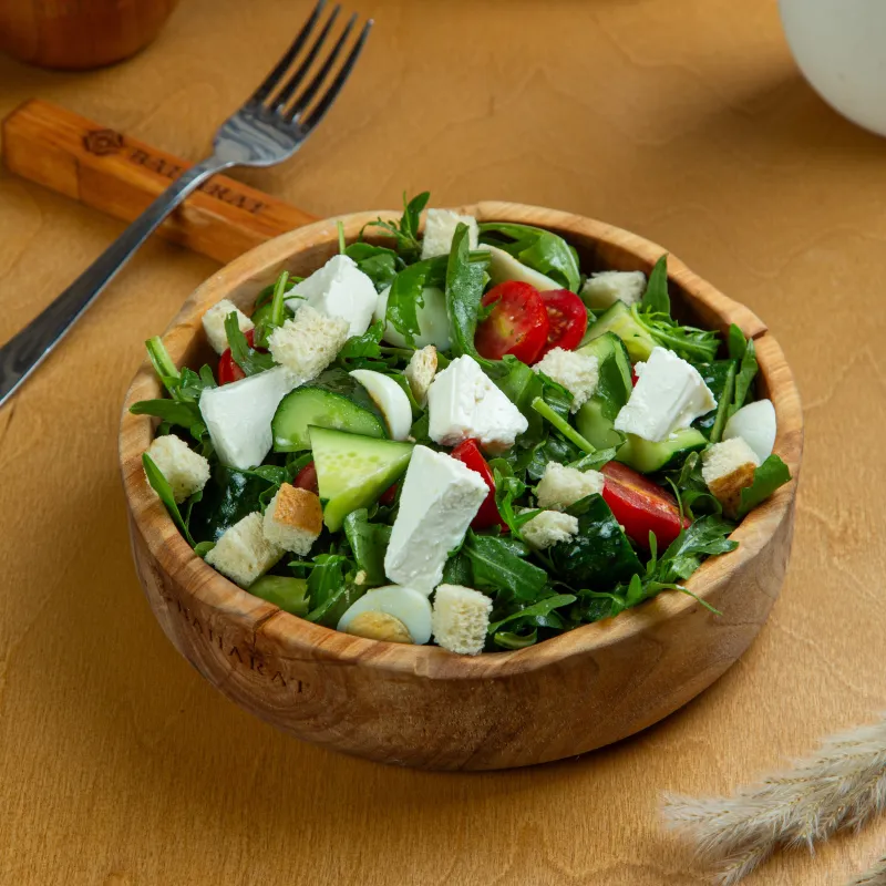 Брынза, руккола, помидоры черри, огурцы, перепелиные яйца, лимон, оливковое масло.