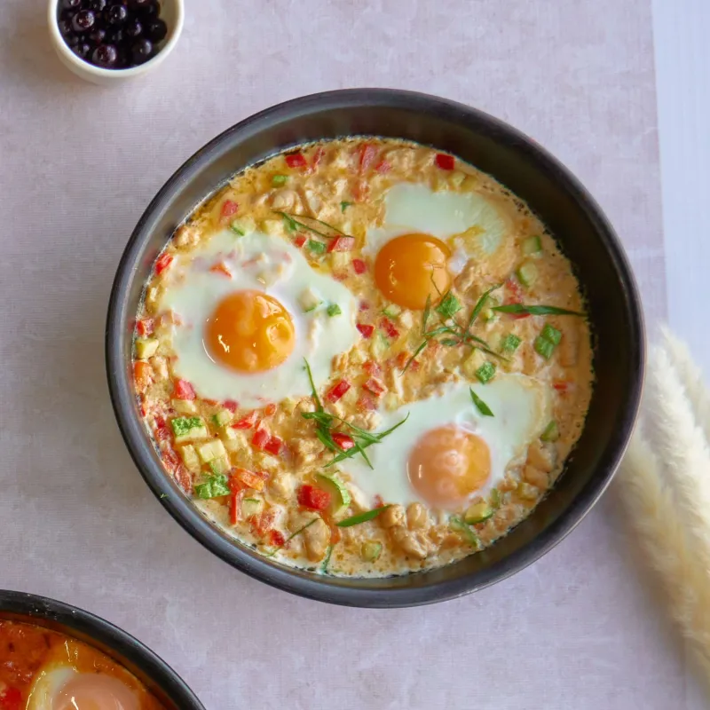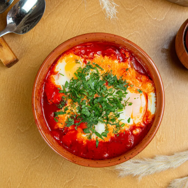 Яйца, перец болгарский, чили перец, помидор, лук репчатый.