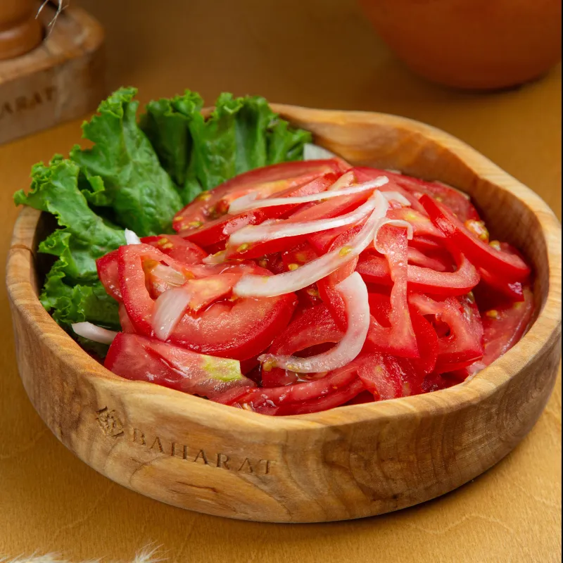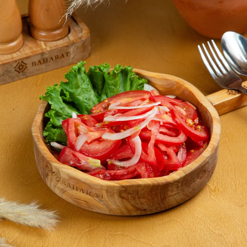Помидоры, огурцы, репчатый лук, заправляется подсолнечным маслом.