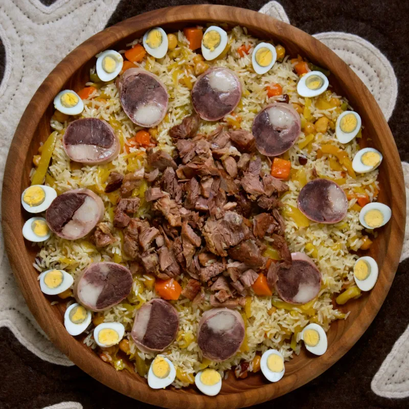 Приготовленное из риса лазер, привезенного из Узбекистана, с добавлением нута, изюма, зиры, казы и перепелиных яиц.