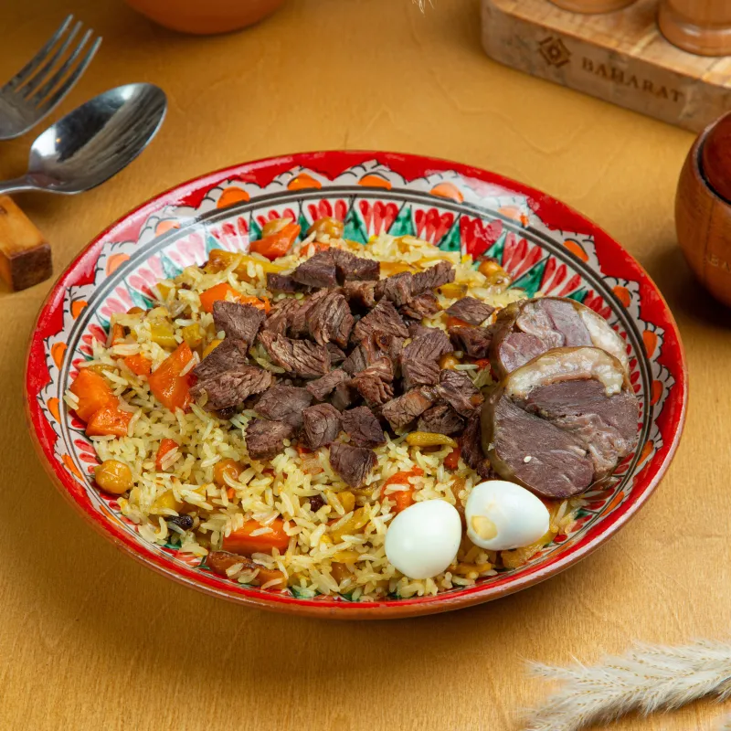 Приготовленное из риса лазер, привезенного из Узбекистана, с добавлением нута, изюма, зиры, казы и перепелиных яиц. На 4-5 персон