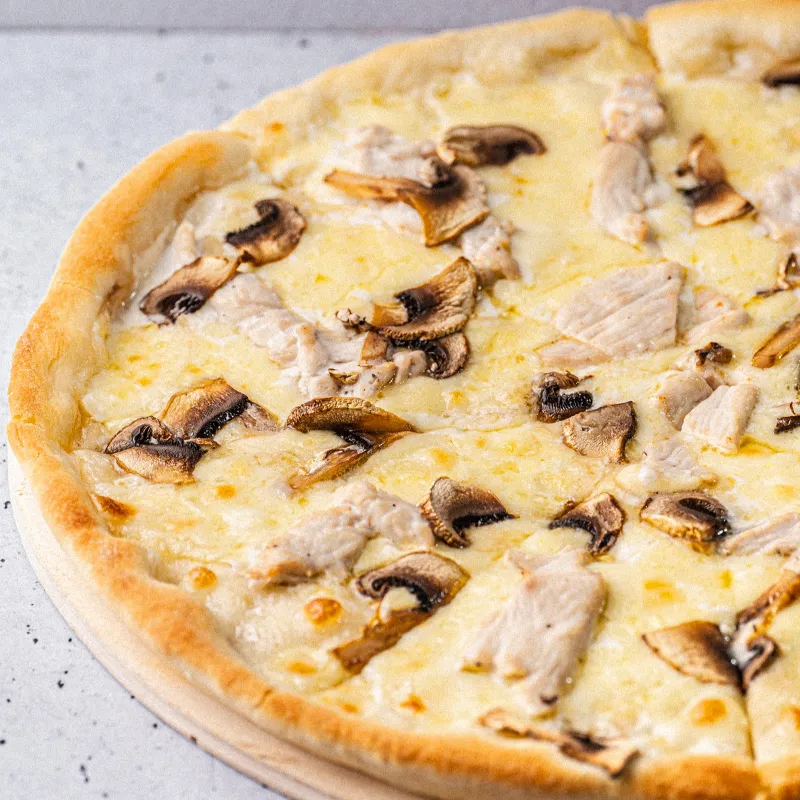 Пицца с курицей и грибами - вкусное сочетание теста, куриного мяса, грибов и сыра.