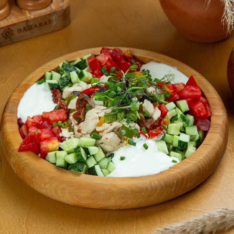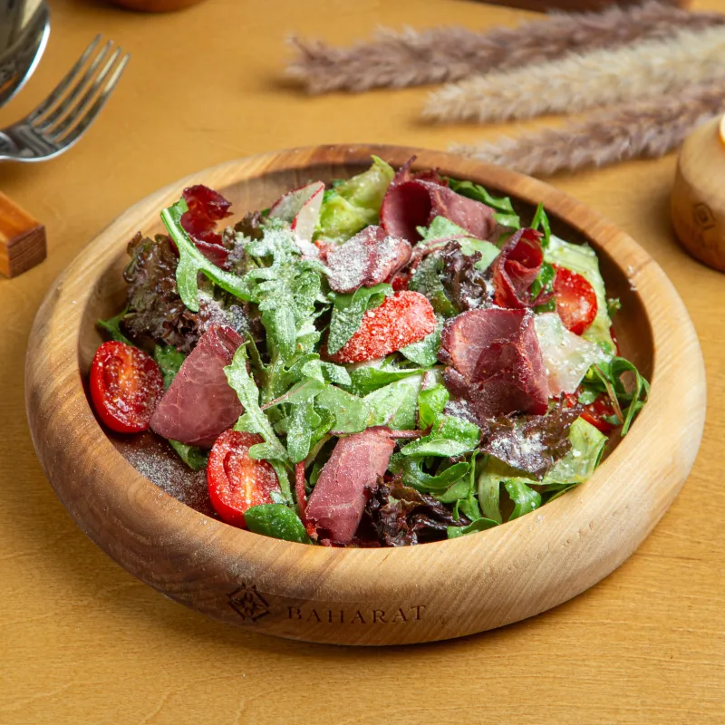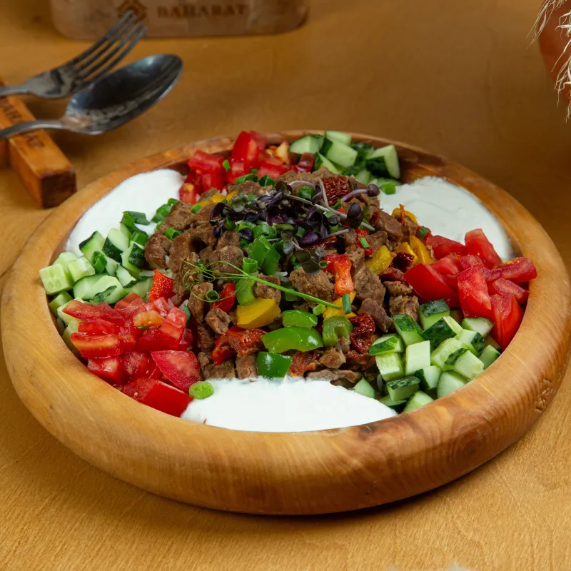 Мясо конины, руккола, черри, мангольт, лист салата, айсберг, редиска, курт.