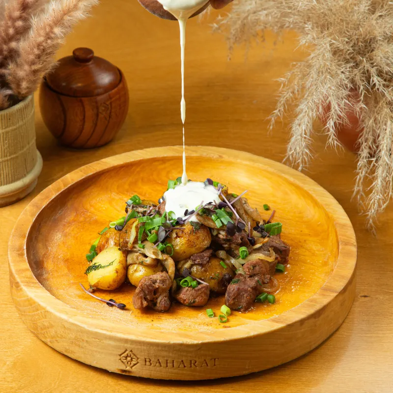 Мясо конины обжаренный в домашней сметане с луком и картофелем. Подается с лепешкой.