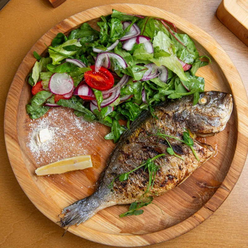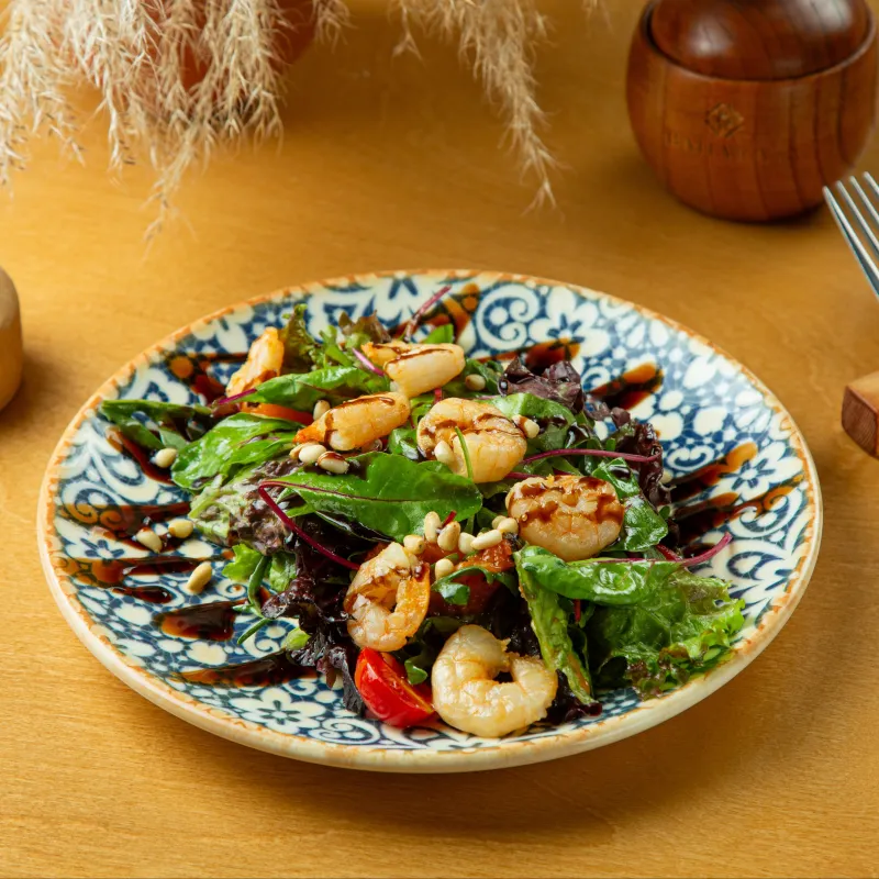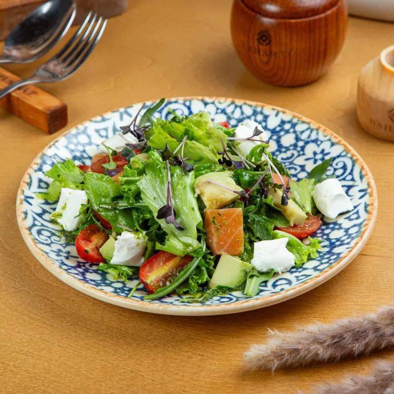 Руккола, маринованная семга, твороженный сыр, лист салата, авокадо. Заправляется соусом песто.