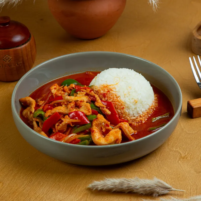 Традиционное уйгурское блюдо с курицей, ароматными овощами , обладающее богатым вкусом. Подается с рисом.