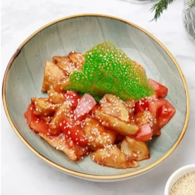 Баклажаны, помидоры, креветки, кисло-сладкий соус.
