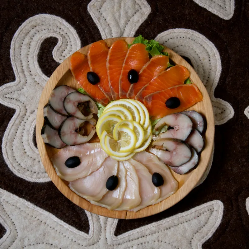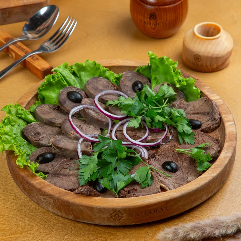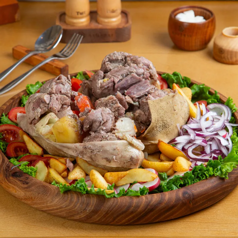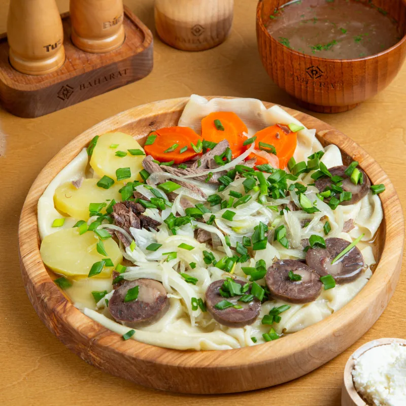 Бешбармак - традиционное казахское блюдо, состоящее из мяса конины и казы, подается с сорпой. Двойная порция мяса и казы. На 4-5 персон