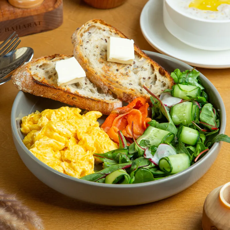 Скрэмбл из яиц, лосось, хлеб тартин, омлет, свежая зелень, сливочный сыр.