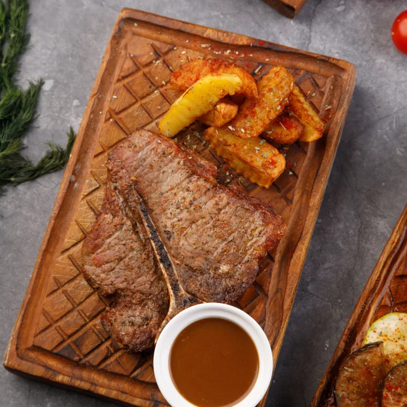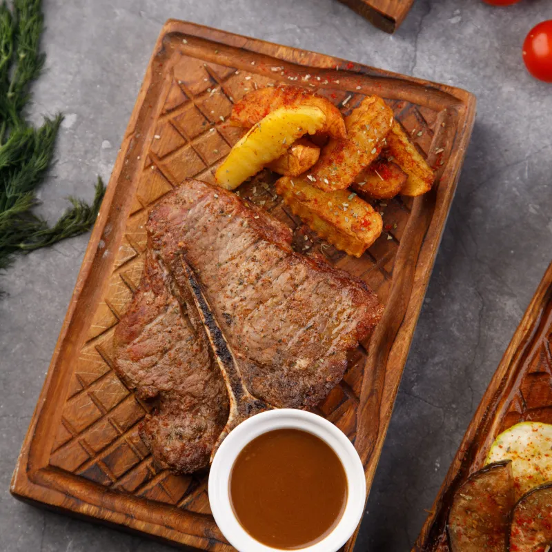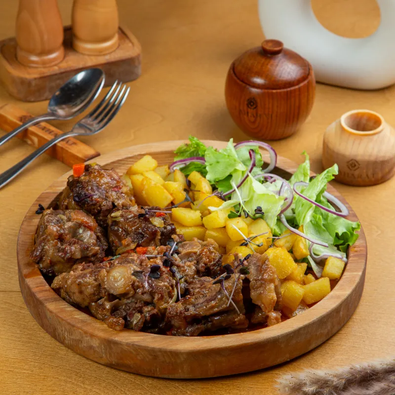 Нежное мясо бычьего хвоста, томленое до мягкости, подается с румяным картофелем и свежей зеленью, создавая насыщенное и ароматное блюдо.