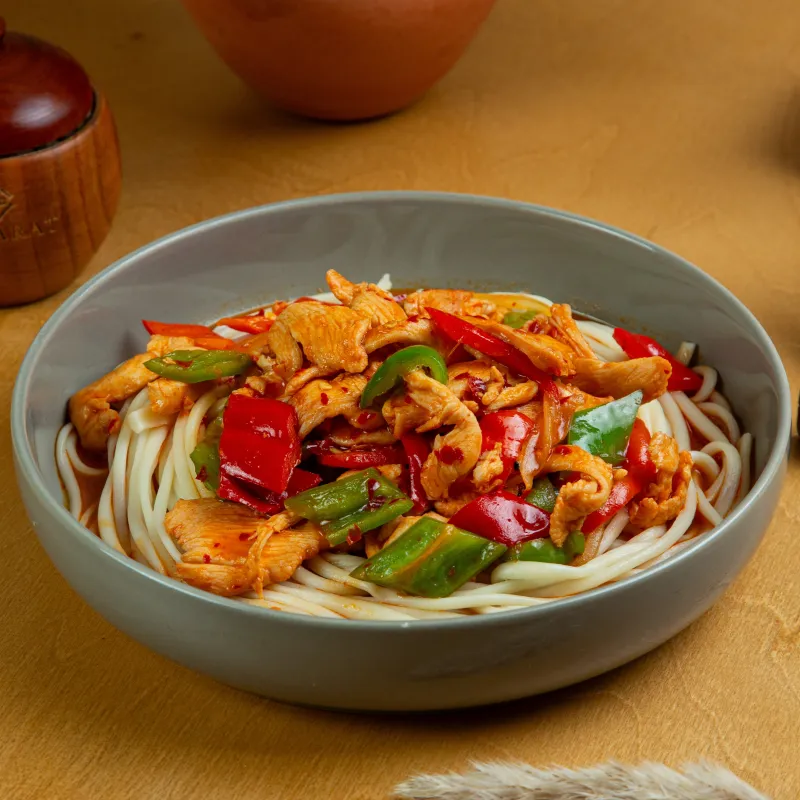 Традиционное жареное уйгурское блюдо с курицей, ароматными овощами , обладающее богатым вкусом. Тесто лепим вручную.