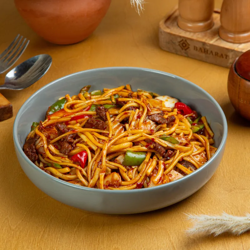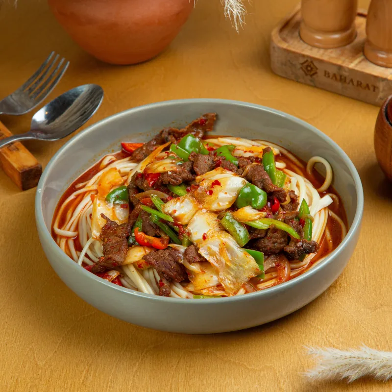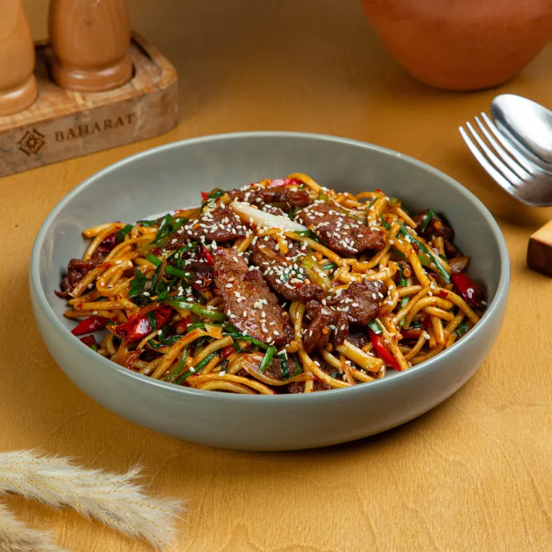 Фирменный лагман Baharat с мясом из говядины, древесными грибами, полу горьким перцем, бассай, репчатым луком, фунчозой. Подается отдельно в трех тарелках.