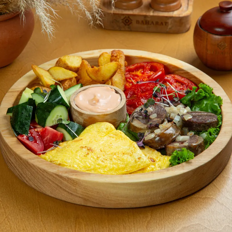 Омлет, казы, помидоры, салат, картофельные дольки, соус.
