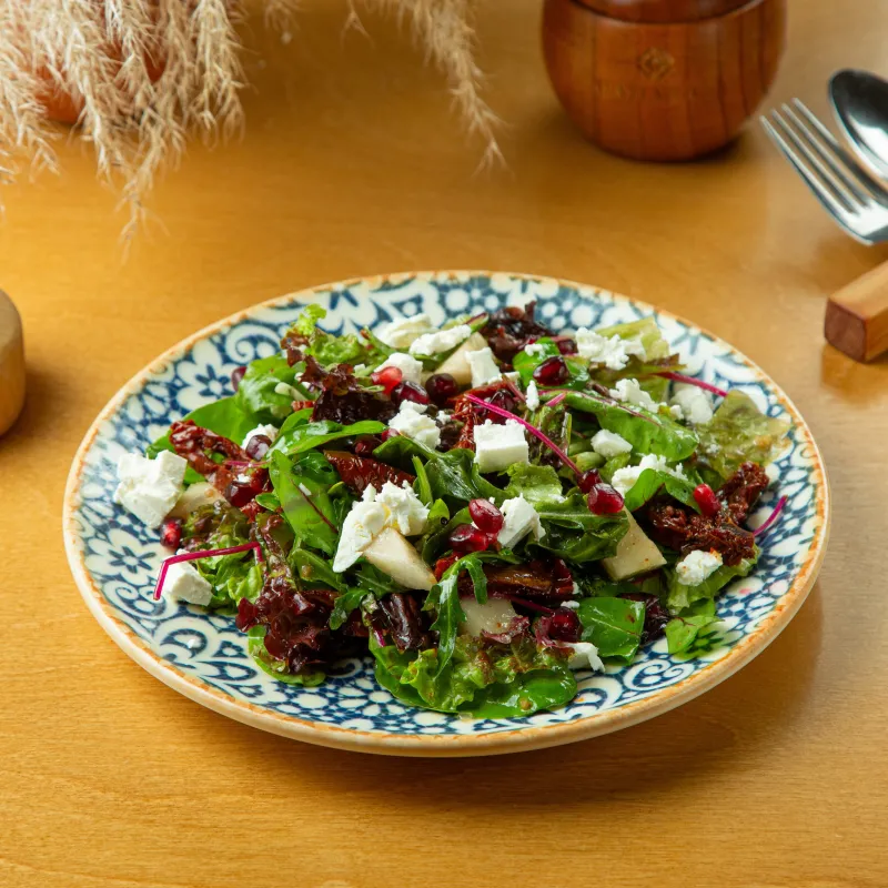 Листья салата, свёкла, грецкие орехи, салакис, груша.