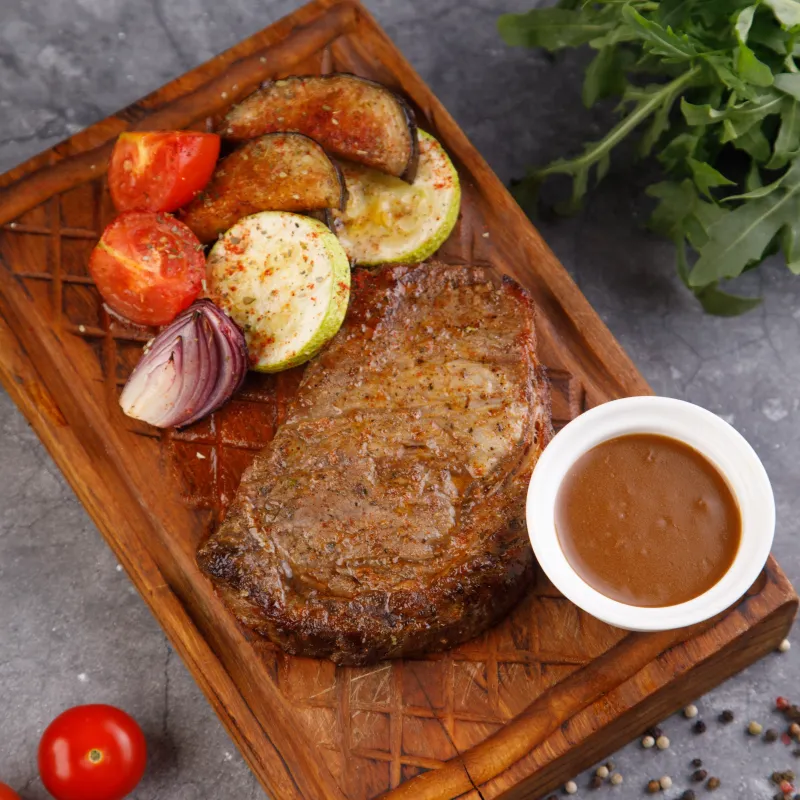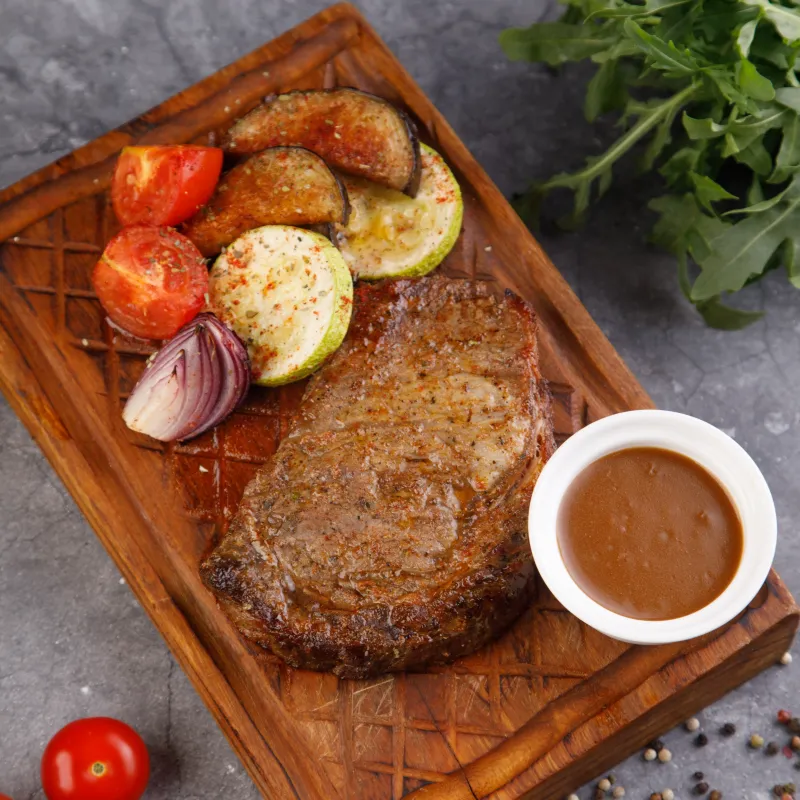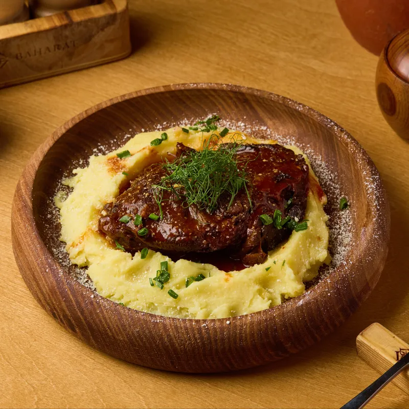 Нежные говяжьи щечки, томлённые до мягкости, подаются с воздушным картофельным пюре и ароматным соусом.