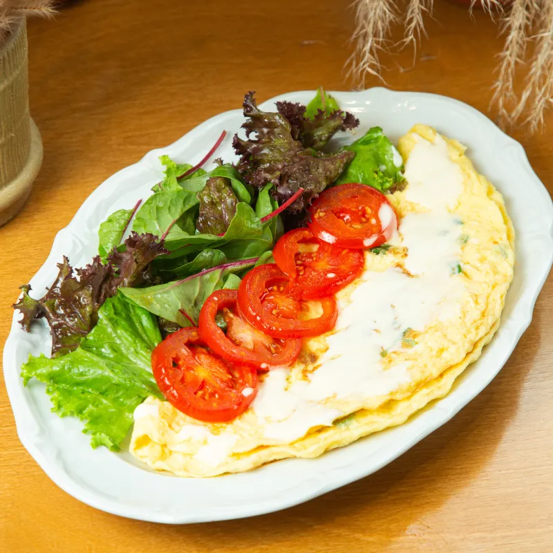 Нежный омлет, приготовленный из свежих яиц, подаётся с домашней сметаной.