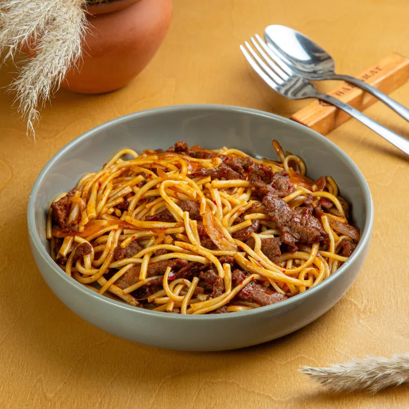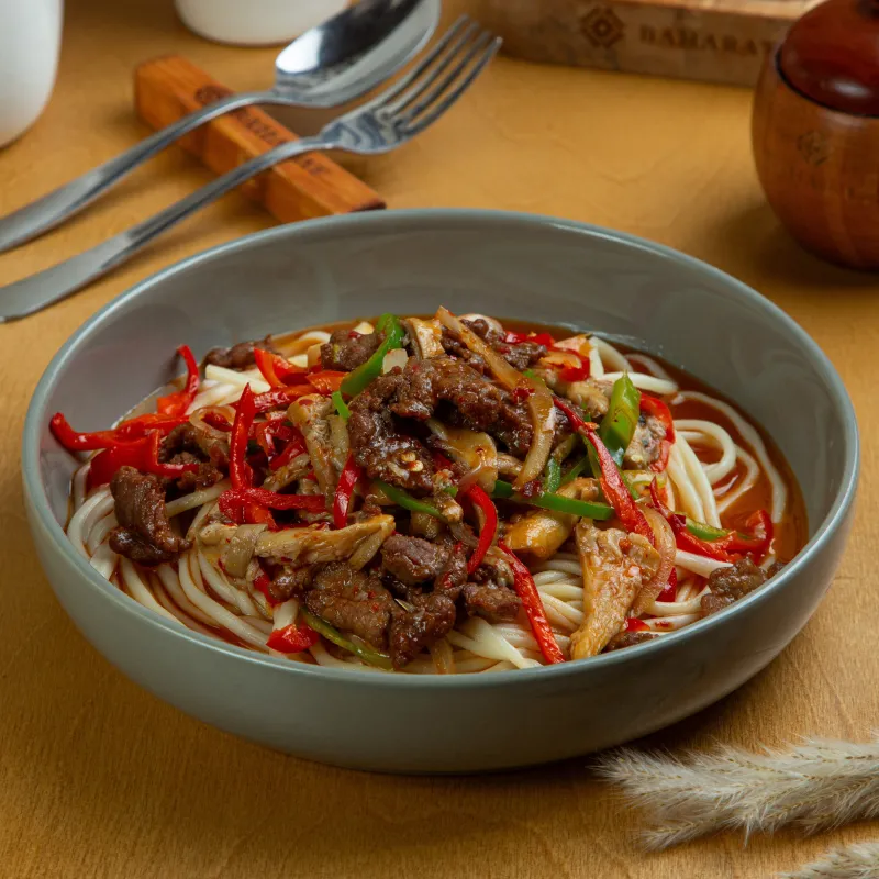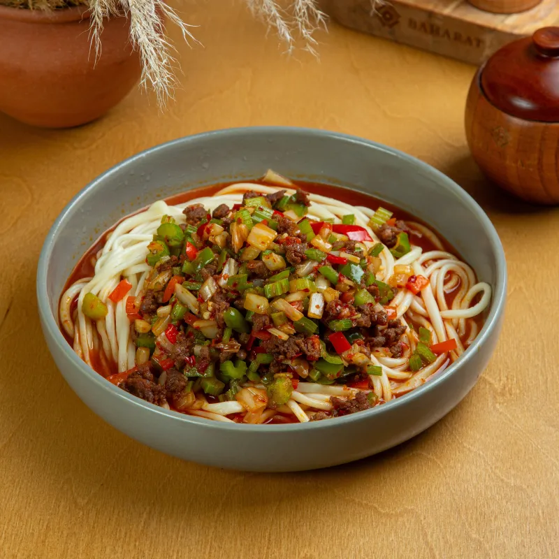 Традиционное уйгурское блюдо,сочным говяжьим мясом и мелконарезанными овощами. Обладающее богатым вкусом. Тесто лепим вручную.