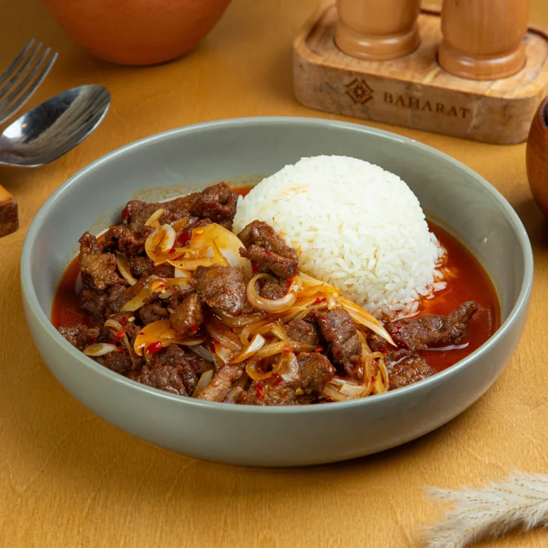 Традиционное уйгурское блюдо, сочным говяжьим мясом и репчатым луком. Обладающее богатым вкусом. Подается с рисом