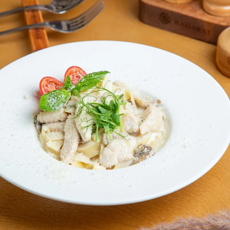 Фетучини с курицей и грибами - это итальянское блюдо, состоящее из лапши фетучини, обжаренной куриной грудки и грибов, приправленных специями и пармезаном