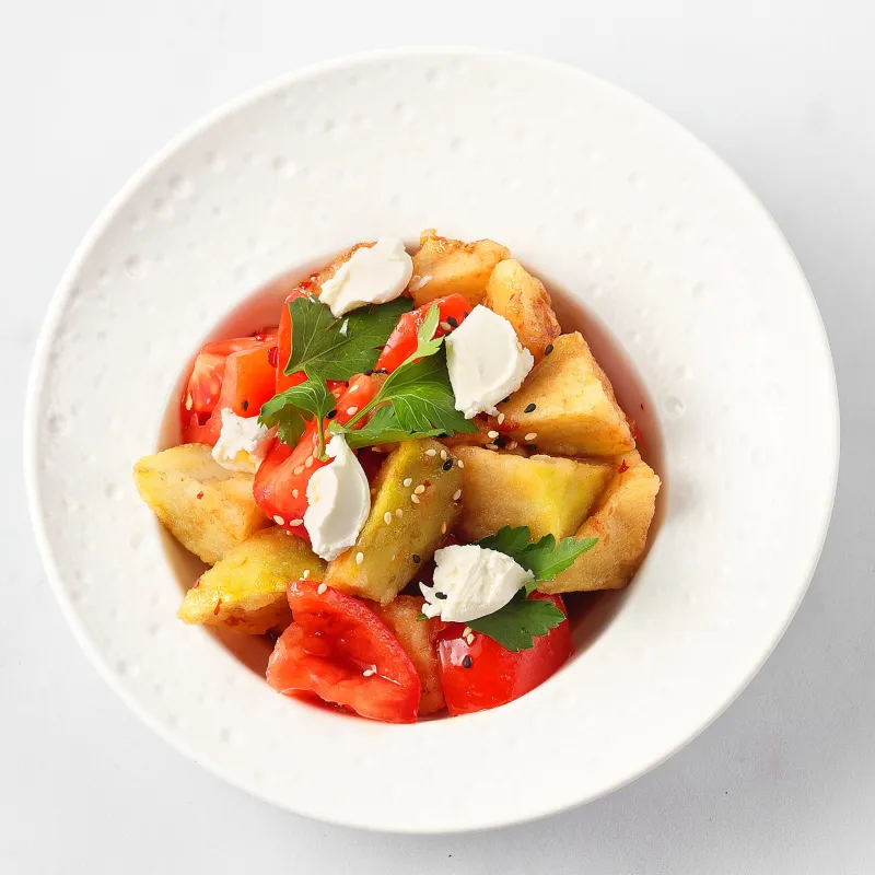 Руккола, помидоры, соус свит-чили, крем бальзамик и творожный сыр