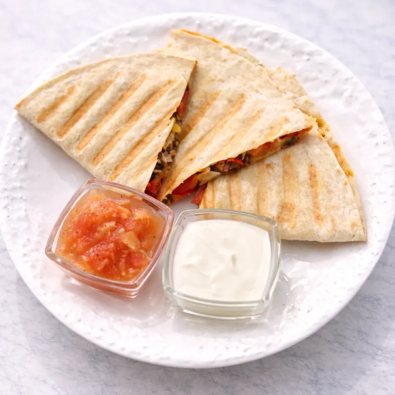 Лепешка тортилья, томленая говядина,кукуруза,перец светофор,красный лук,сыр чедер,моцарела. Подается с сметаной и сальсой