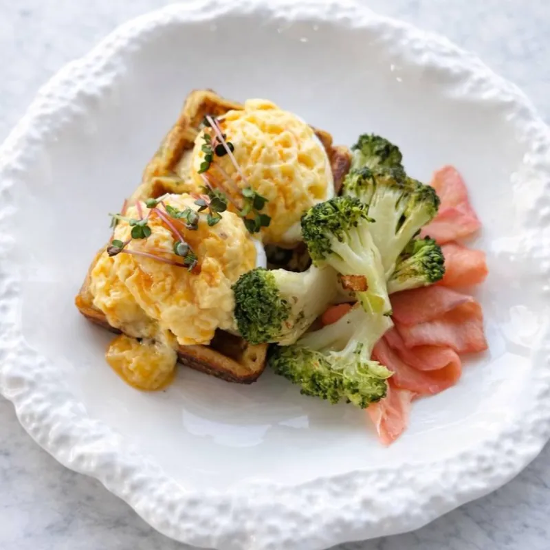 Вафли из брокколи и картофеля, подаются с яйцом пашот и голландским соусом