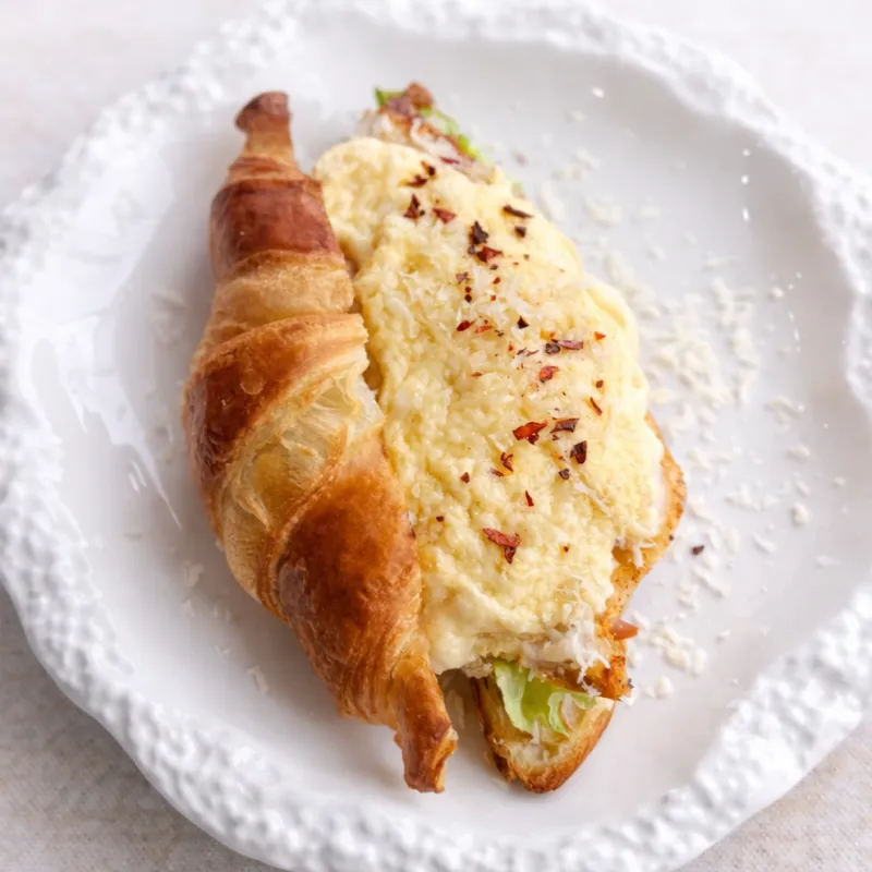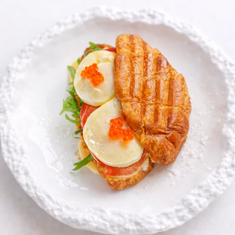 Классический круассан с сыром, яйцами-пашот и голландским соусом. Внутри слабосоленый сёмга и руккола