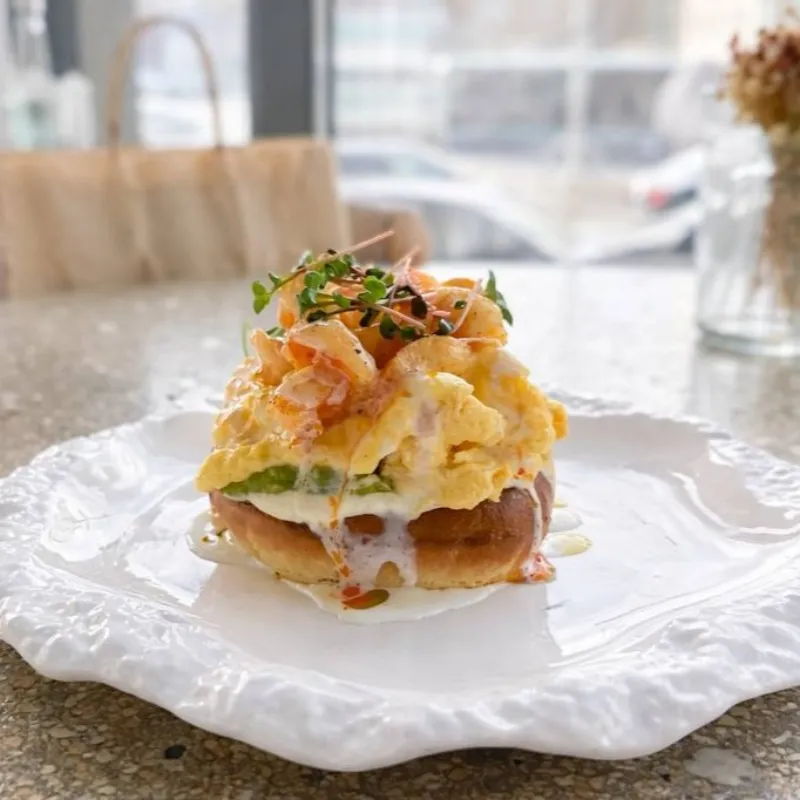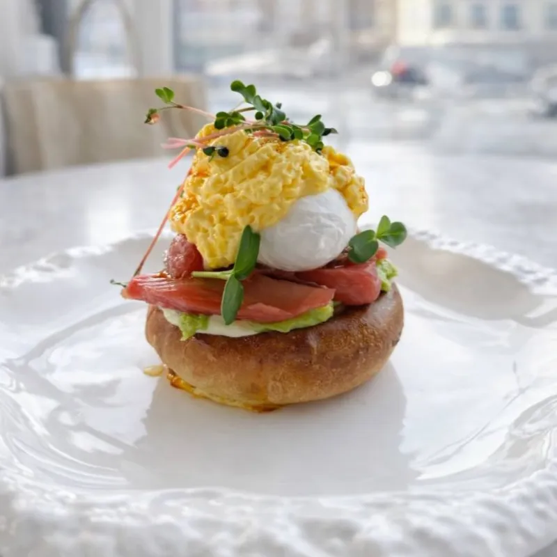 Булочка бриошь с гуакамоле, нежным скрэмблом и тигровыми креветками, под голландским соусом. Подаётся с фирменным зелёно-красным маслом: паприка и петрушка