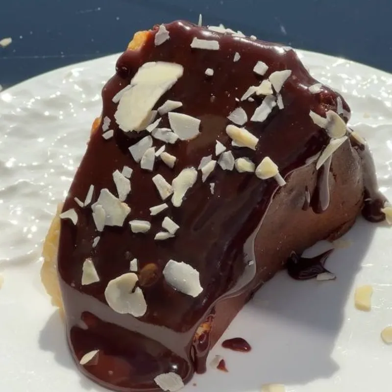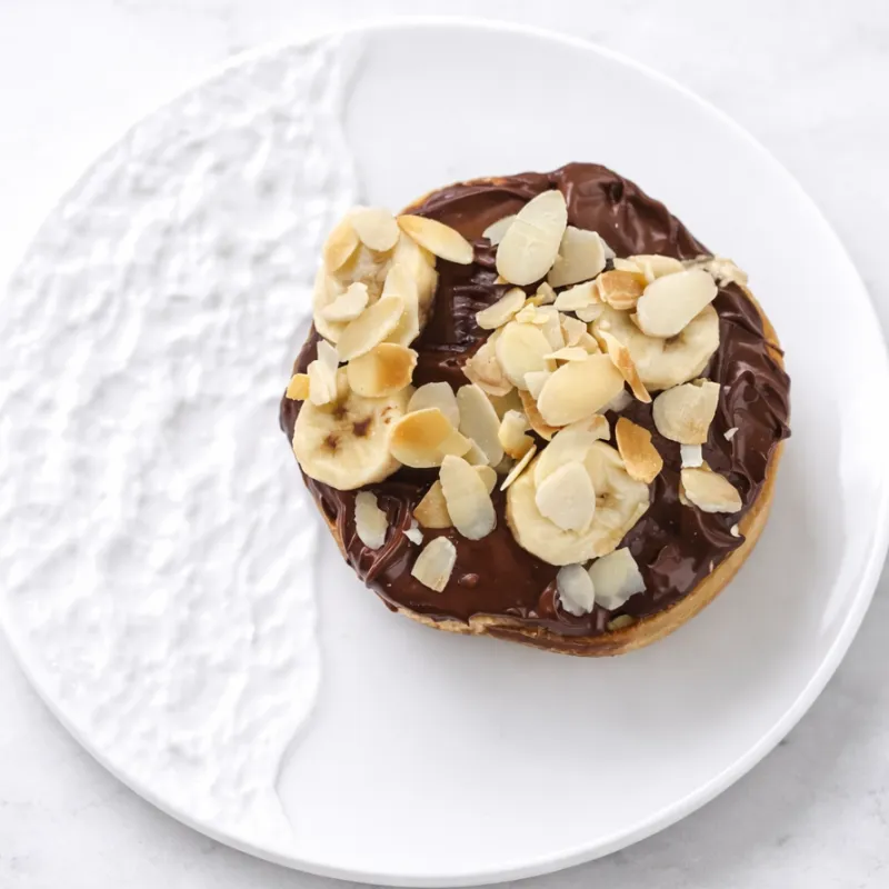 С шоколадным соусом, лепестками миндаля и со слайдами банана