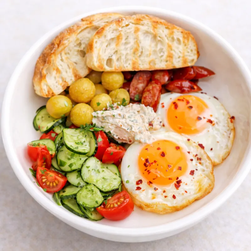 Яичница, свежие овощи, картофельные шарики, колбаски, чиабатта с творожным сыром, зеленью и вялеными томатами.
