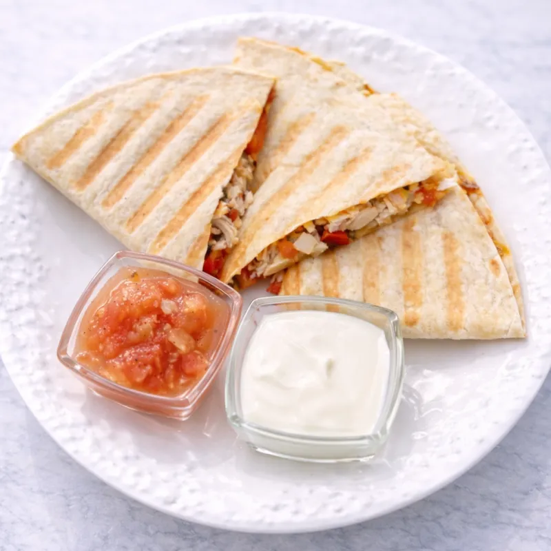 Лепешка тортилья, куриное филе,кукуруза,перец светофор,красный лук,сыр чедер,моцарела. Подается с сметаной и сальсой.