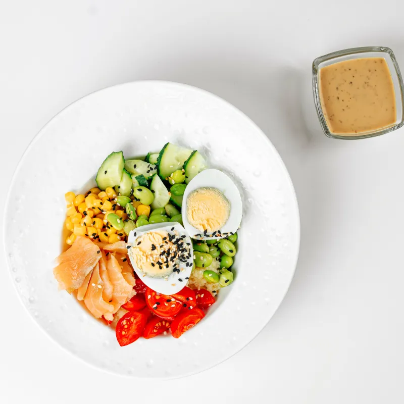 Кус-кус, сёмга/курица, огурец, помидоры черри, бобы эдамаме, кукуруза, ореховый соус