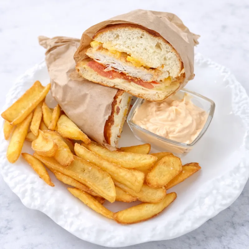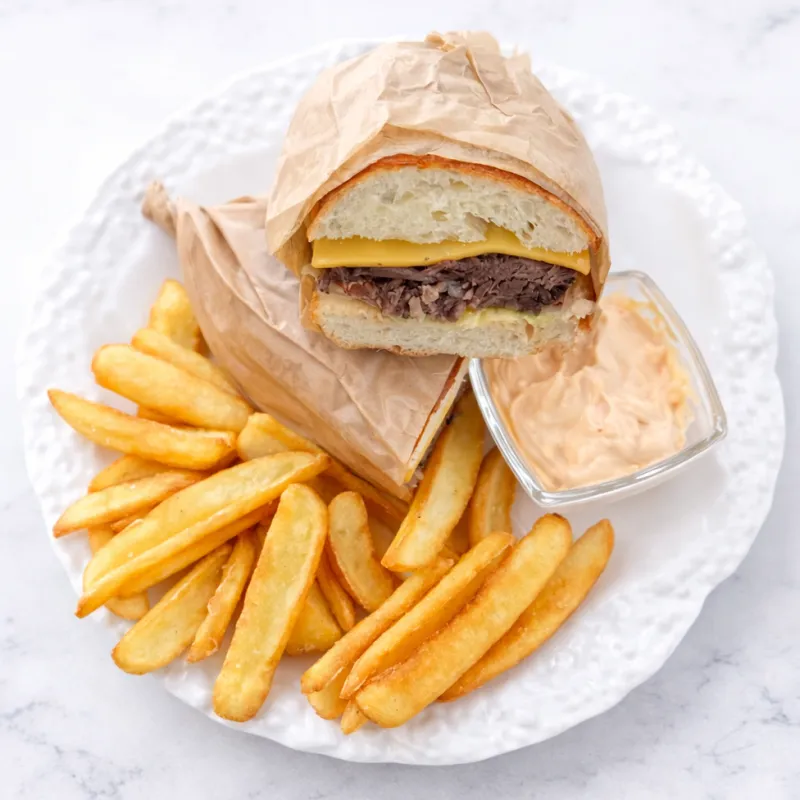 Телятина томленая, фирменный соус, айсберг, помидор, сыр чедар подается с картофелем фри и сырным соусом