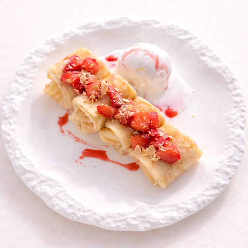 Тонкие блинчики, бананы, клубника, сливочное мороженое, лепестки миндаля