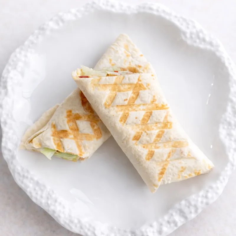 Лепешка тартилья , соус цезарь , куринная грудка в панировке , салатный лист айсберг , помидоры и огурцы