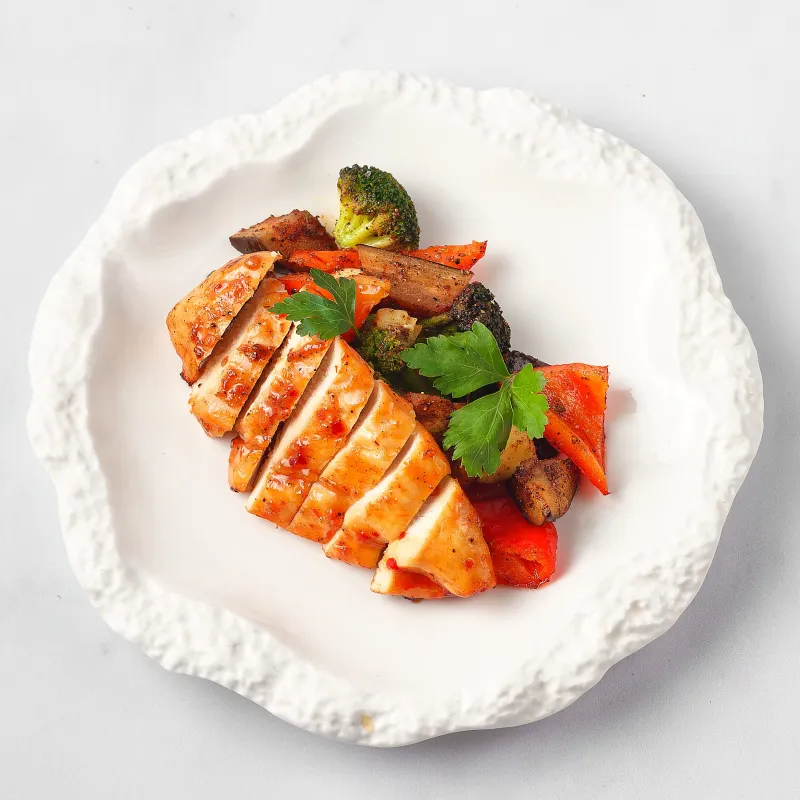 Сочное куриное филе с брокколи, кабачки, баклажаны, болгарский перец. Подается с соусом свит-чили