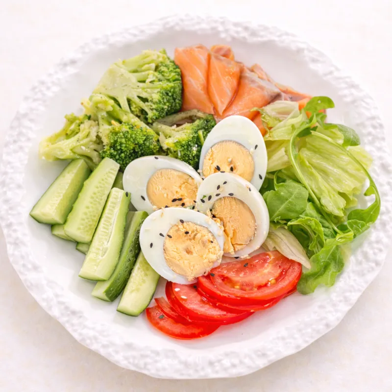 Отварные яйца, помидоры, огурцы, семга, микс салата. Подается с хлебом