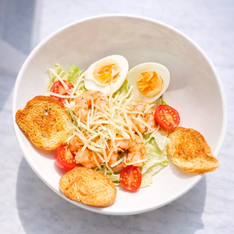 Салат айсберг, руккола, помидоры черри, крутоны, соус цезарь и пармезан