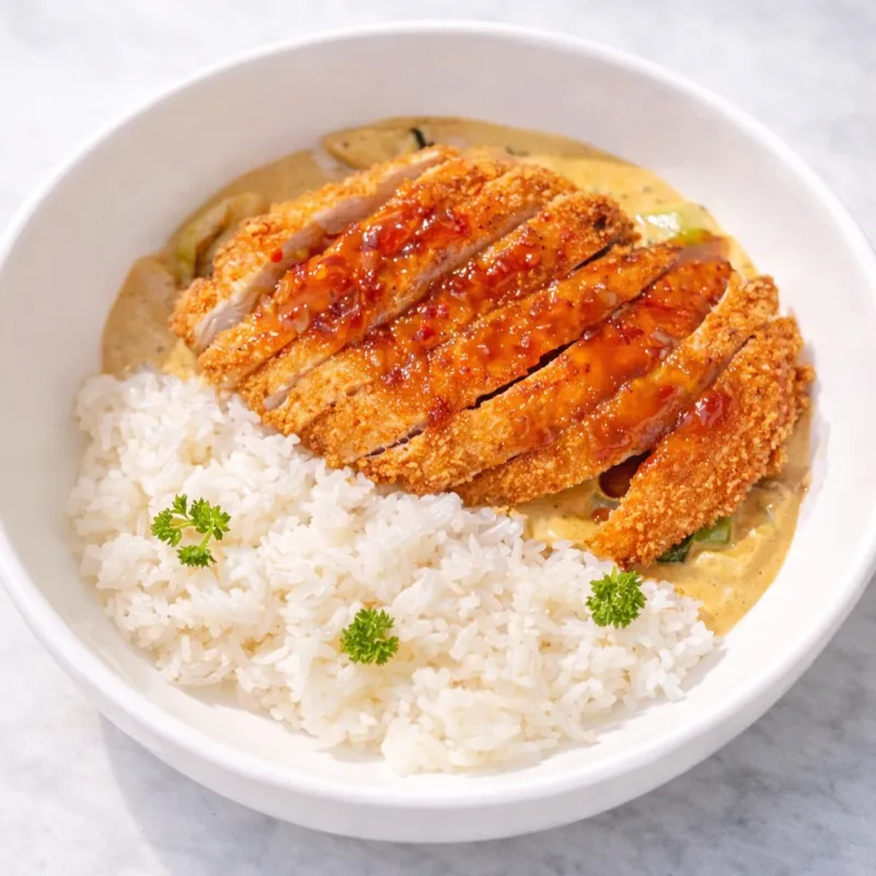 Хрустящая курочка в панировке с овощной подушкой в соусе карри. Подается с рисом и соусом свит Чили
