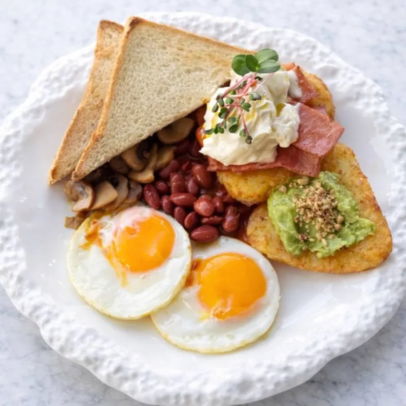 Авторский деревенский завтрак: хешбраун, говяжья ветчина (халяль), глазунья, красная фасоль и обжаренные шампиньоны. Подаётся со сметаной