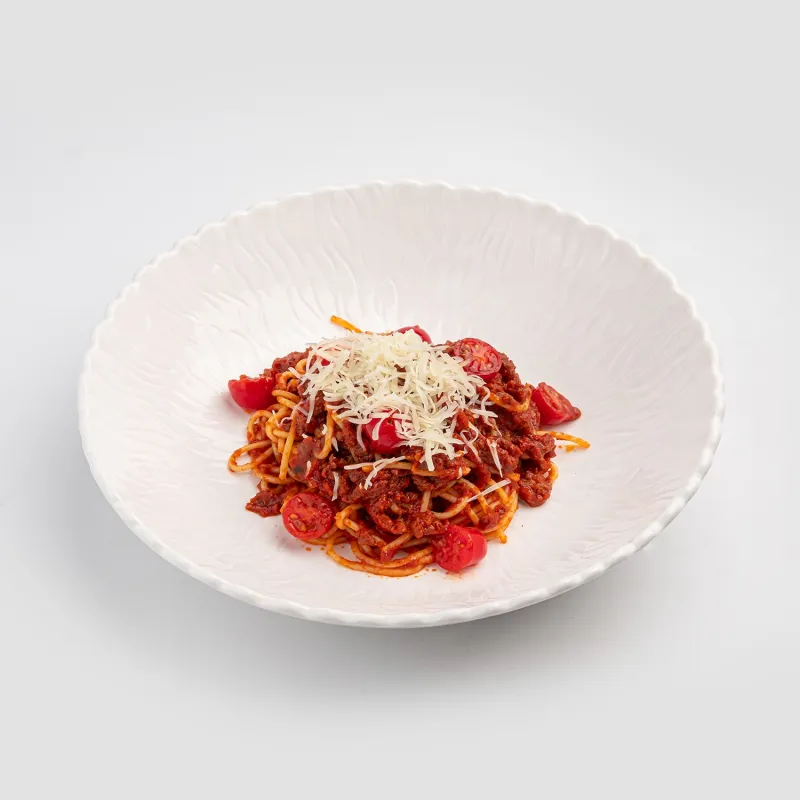 Паста итальянская, говяжий фарш с овощами, соус болоньезе, черри, пармезан