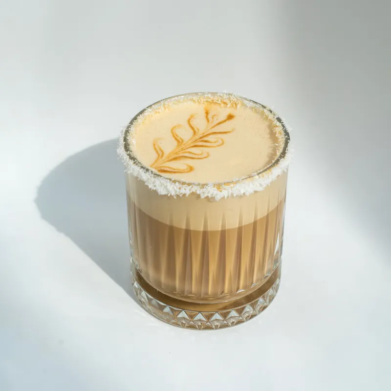 Кофейный напиток, приготовленный на миндальном молоке с легким привкусом ванили и куркумы. Украшается золотом