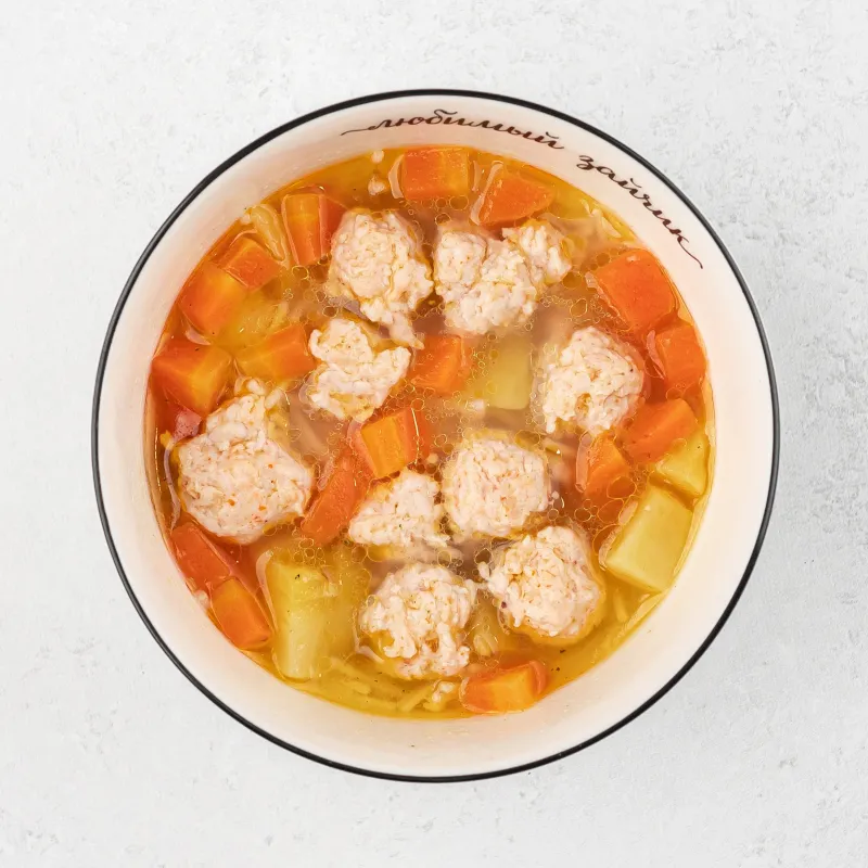 На курином бульоне с фрикадельками из фарша нежной курицы, с добавлением сливочного масла, морковью, картофелем и лапшой «паутинка».