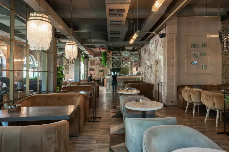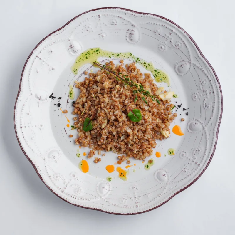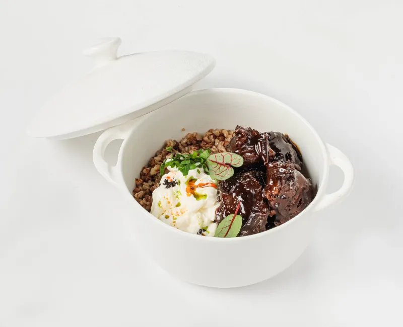 Рагу из телячьих щечек запечённых со специями и овощами. Приготовленное в соусе демиглас. Подается с пряной гречкой, томленой с тимьяном и пармезаном и сливочной страчателлой.