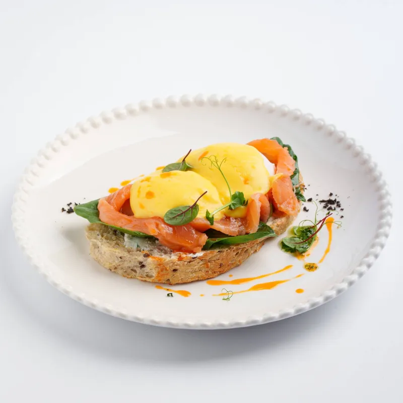 злаковый хлеб, крем чиз, шпинат, слабосоленая лосось, яйцо пашот, голландский соус