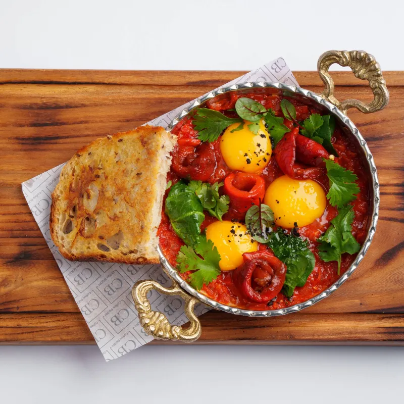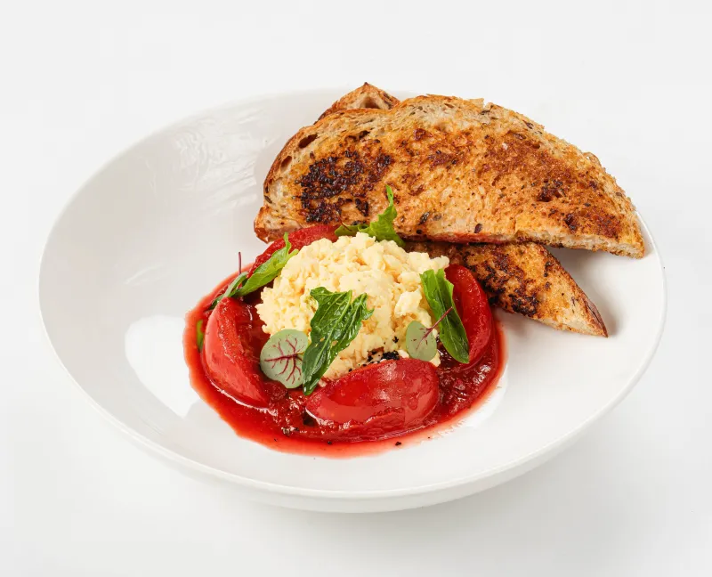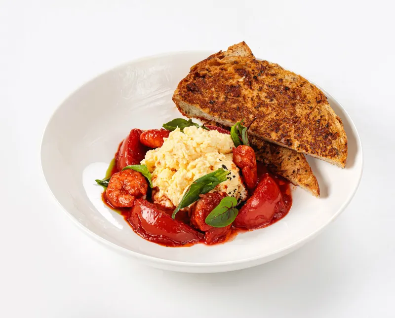 Скрембл из двух яиц с добавлением сметаны, приготовленный с пряным томатным соусом, с томатами или с томатами и креветками на выбор. Подается со злаковой брускетой поджаренной на сливочном масле со специями и печеным чесноком.
