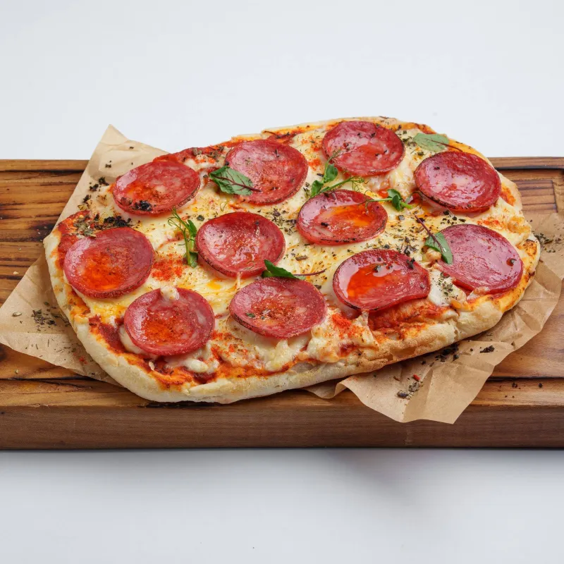 хрустящее воздушное тесто, соус томатный, колбаса пепперони